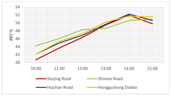 The simulation results show that the external PET temperatures were roughly 51.75–52.90 °C, but the average radiation temperatures inside the street were clearly different (Figure 18). The north–south street temperatures were similar to the external environment, and the east–west street temperatures were obviously lower than the external environment, but the entire street was in an extreme thermal stress reaction environment (Table 2). The average radiation temperatures of the east–west Shimao Road in the Shimao Road–Shajing Road area were 48.62–51.86 °C, but there would be a local high-temperature area in the west, and the temperatures could reach 56.18–57.26 °C. Shajing Road’s average radiation temperatures in the north–south direction ranged between 50.78 and 51.86 °C. The average radiation temperatures of the east–west Huizhan Road in the Huizhan Road–Hongguzhong Avenue area were 50.44–51.65 °C, with a high-temperature area on the west side ranging from 52.87 °C to 54.09 °C. In the north–south direction, the average radiation temperatures of Hongguzhong Avenue were between 50.44 °C and 52.87 °C. Inside the street, the temperatures dropped as one moved further north of the building, and the average radiation temperatures of World Trade Road’s continuous street surface were also lower than those of Huizhan Road’s relatively discontinuous street surface. The average radiation temperatures at the intersection of Huizhan Road and Hongguzhong Avenue were clearly higher than 26.71 °C.
