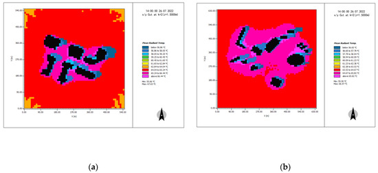 (a) Simulation of the MRTs at 14:00 in Shajing–Shimao Road in the summer. (b) MRT simulation of Huizhan–Hongguzhong Avenue at 14:00 in the summer.