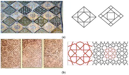 Geometry, as a branch of mathematics, played a vital role in the creation of IGPs. IGPs are decorative elements that mainly styled the exteriors and interiors of Islamic buildings (i.e., mosques) and palaces. Albert et al. [] defined IGPs as “basic decorative elements of Islamic architecture consisting of a pattern formed by a set of small pieces with simple shapes (straight lines and arcs”. IGPs show four recognizable characteristics: symmetry, interlacing, unboundedness, and flow []. IGPs consist of a repeated unit, a polygon that holds the base geometry, and a repetition structure that is the product of systematically repeating the seed unit to fill the space []. The main elements of Islamic patterns include geometric, calligraphic, and floral patterns []. The floral design represents nature, and its motifs are inspired by the shapes and colors of flowers and trees. The calligraphic pattern is an essential part of Islam because it uses Quran writings. Geometric pattern relies heavily on the repetition and symmetry of basic geometric shapes to generate a unique pattern. It can be applied in a simple form as well as in a richly complicated design. In fact, Dabbour [] claimed that Islamic designs heavily rely on geometry; it has a central role and great importance to Islamic designs.