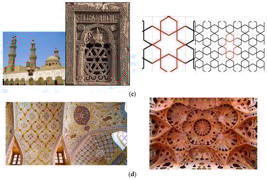 All Islamic geometric patterns originated from circles, as it is claimed to express the unity of Islam. Most of the patterns are based on hexagons and octagons. Figure 1 shows the evolution of the IGPs and the most outstanding examples through the years. The great Mosque of Kairouan (Figure 1a) is designed primarily with vegetal and floral motifs, but some geometrical patterns were noticed. This is an example of the earliest attempts to apply geometrical ornaments in Islamic architecture. Ibn-Tulun Mosque (Figure 1b) welcomed the geometrical patterns where application shifted from fully using vegetal and floral motifs to squares and circles. Six-point geometrical patterns, hexagons, and eight-point geometrical patterns were introduced [].