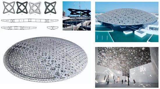 Nowadays, western and non-Muslim environments have adopted Islamic patterns with contemporary thoughts. Samy and Sobh [] agreed that Islamic patterns can use modern techniques and systems in a new and creative way to be suitable for modern societies and buildings. In fact, architects are taking advantage of new materials and mass production techniques to enrich Islamic art in modern building technology. In other words, Islamic geometric patterns are nowadays developed and represented to suit modern designs. For instance, the Louvre Museum in Abu Dhabi, designed by Jean Nouvel, is amongst the outstanding recent projects that used Islamic patterns in designing the building envelope. This project features eight layers with a triangular pattern as a floating dome structure simulating the filtering of light through the giant mantric Mashrabiya, a traditional Islamic lattice typically used to enclose large second-story openings in houses and buildings []. This is presented in Figure 2.