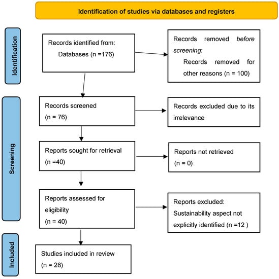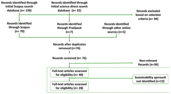 The literature search Ided various keywords such as: “Islamic geometric patterns”, “modern designs”, and “sustainability”. Because these keywords are very wide and commonly used, the results of the initial search were only limited to the titles of the papers. The selection criteria included all English language open-access journals that were published in the last 10 years (2012–2022); 2023 was excluded. Duplicated articles, literature reviews, and irrelevant articles were excluded. A manual screening was conducted by the author to exclude irrelevant articles based on skimming through the abstracts of each paper. A total of 40 publications were assessed and categorized based on their relevance to the sustainability pillars. All 40 articles were carefully read, and information on the research objectives was extracted and recorded on a separate Excel sheet. After comprehensively reviewing the articles, another 12 articles were excluded as the sustainability perspective was not part of their IGP study. This has limited our research to 28 articles only, as presented in the outlined box in Figure 4. Figure 5 is the PRISMA flow diagram.