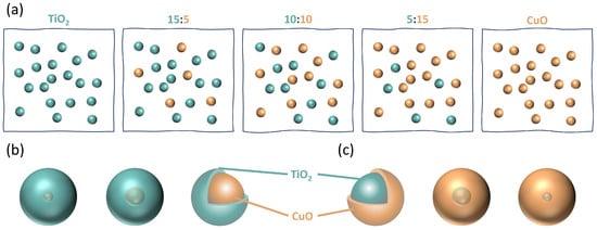 TiO and CuO nanocomposites constituted by 30 nm outer diameter (a) TiO/CuO nanoparticles (variations of 5%), (b) CuO@TiO and (c) TiO@CuO core–shells (5, 10 and 20 nm inner diameters) at fixed total 20% particle volume ratio (not to scale).