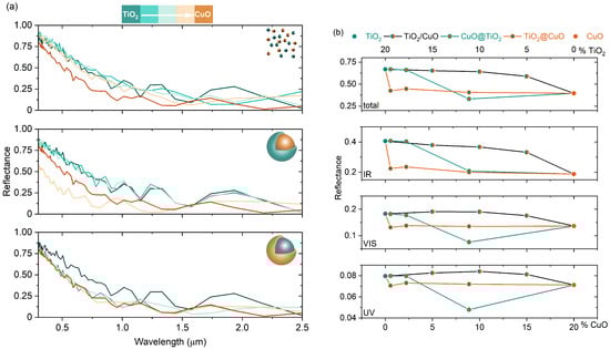 (a) Reflectance as a function of TiO and CuO 30 nm diameter nanoparticles incorporation at 20% particle volume fraction (TiO/CuO variations of 5%), TiO and CuO 30 nm diameter core–shells incorporation at 20% particle volume fraction for CuO as core and TiO as shell (CuO@TiO) and TiO@CuO (5, 10 and 20 nm inner diameters). (b) Total reflectance and IR, VIS and UV reflectances as a function of the TiO-CuO/acrylic volume ratio for the configurations shown in (a).