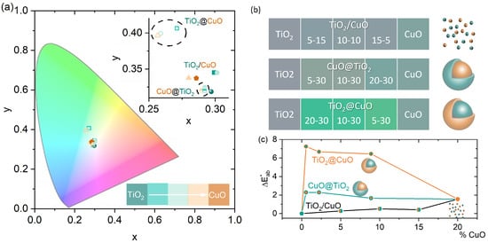 (a) Color coordinates of pigmented coatings for different nanoparticle mixtures (closed symbols) and core–shells (open symbols; the inset shows the x-y plane in more detail). (b) Corresponding RGB color with nanoparticle mixing (top) and core–shells with TiO (middle) and CuO (bottom) as shell for input and output illuminant and reference angle of D65 10. (c) Color difference in relation to single TiO nanoparticles.