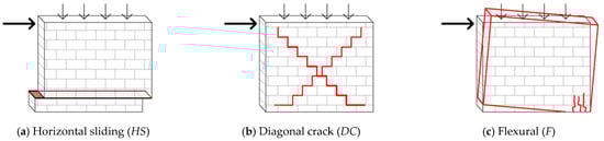 Three main in-plane failure mechanisms can occur in masonry walls, namely, horizontal shear sliding, diagonal shear failure, and in-plane flexural/rocking failure (Figure 1a–c, respectively). Depending on the wall boundary conditions, out-of-plane mechanisms can also occur; some insights into this failure mode can be found in Valluzzi et al. []. In this section, a critical literature review of the main experimental results of material characterization tests (Figure 2b,c) and in-plane cyclic tests (Figure 1a–c) is presented.