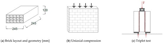 Sketch of (a) the brick unit considered with a void ratio greater than 60%, (b) the uniaxial compressive actions, and (c) the triplet test.