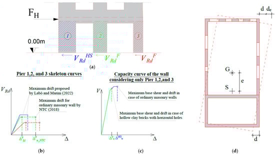 (a) Sketch of a possible building façade; (b) skeleton curves of pier 1 (blue), pier 2 (green), and pier 3 (red), [,]; (c) capacity curves of the wall considering only piers 1, 2, and 3 in case of ordinary wall (blue) and hollow clay bricks with horizontal holes (green); (d) sketch of a torsionally weak building. G and S are the gravity and shear center, respectively; e is the in-plane eccentricity, and de is the increase in terms of displacement due to the torsional effects.