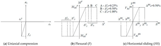 The inelastic behavior was accounted for by lumped plastic hinges. For the RC elements, plastic hinges developed based on EC8 recommendations were considered []. As for the masonry walls, flexural and sliding shear failure were modeled; the behavior curves of the mechanisms are plotted in Figure 5. In the definition of the plastic hinges, the axial force was considered; it is worth noting that no tensile resistance was accounted for (Figure 5a). As for the compression, the maximum force was defined as (where ) and the ultimate strain () was set equal to 0.1% [].