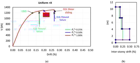 (a) Capacity curves in the x-direction. The green, blue, and red lines are the capacity curves in the cases in which was considered as equal to 0.25%, 0.50%, 1.00%, respectively. The asterisk represents a flexural failure mechanism (c), while the triangle (▴) represents a sliding shear failure mechanism (d); (b) inter-story drift distribution along the building height at the failure step.