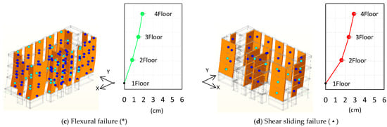 According to the current code [], the collapse limit state (CLS) performance points were set at the displacement at which the ultimate capacity of the first masonry wall was reached; thus, when or was reached. The life safety limit state (LSLS) is assumed to be reached when ¾ of the CLS lateral displacement is reached []. In Figure 6a and Figure 7a, the CLS is marked with a triangle (▴) or an asterisk (*) when the horizontal sliding or flexural capacity were reached, respectively. The plots of the plastic hinge state at the CLS are plotted in Figure 6c,d and Figure 7c,d for the x- and y-direction, respectively. The LSLS performance points are plotted with full dots. In Figure 6b and Figure 7b, the inter-story drift profile at the CLS is plotted.