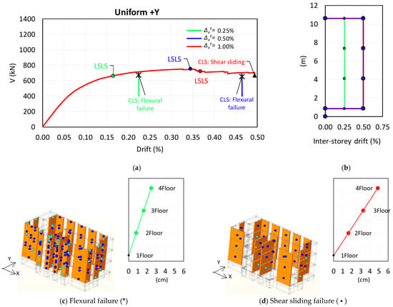 (a) Capacity curves in the y-direction. The green, blue, and red lines are the capacity curves in the cases in which was considered as equal to 0.25%, 0.50%, 1.00%, respectively. The asterisk (*) represents a flexural failure mechanism (c), while the triangle (▴) represents a sliding shear failure mechanism (d); (b) inter-story drift distribution along the building height at the failure step.