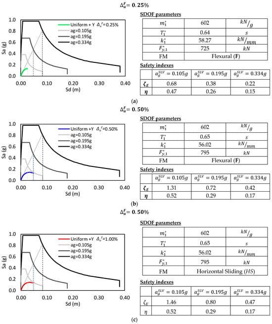 Assuming a constant inter-story drift of the retrofitted building, the drift design target of the whole building is set to match the ultimate drift of the individual masonry pier (Section 3) to prevent or limit damage to hollow brick masonry piers. For each case, the design targets are given as ; more precisely, were set for the three different cases of , respectively. The drift of the SDOF system was considered and equated to the drift of the MDOF system.