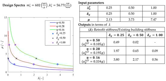 Defining the strength parameter as the ratio between the yielding strength of the existing building () and the mass () multiplied by the ground acceleration relative to the elastic period , design spectra plot the ductility demand () to the retrofitted system as a function of the stiffness ratio () for a given value of the existing building period () and a specific value of the strength parameter () in the as-built condition. The ductility demand is the ratio between the maximum displacement () experienced by the retrofitted building during a seismic event and the yielding displacement of the existing building (), and the stiffness ratio is the ratio between the elastic stiffness of the retrofit () and the stiffness of the existing building ().