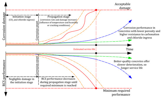 The relation between time and RCS deterioration due to corrosion phenomena is well known. As defined by Tuutti in 1982 [16], two scenarios are considered. On the one hand, the initiation stage, when aggressive agent ( and chlorides) ingress occurs within concrete up to rebars, which results in the progressive disruption of the passive layer on the steel surface and triggers corrosion onset. This results in the second scenario, the propagation stage, when the average corrosion rate rises, but not linearly because it is affected by environmental factors like temperature or humidity. The appearance of cracks also influences this evolution and accelerates degradation up to a maximum level of tolerated damage. Consequently, RCS performance progressively worsens and reaches unacceptable minimums [15] (Figure 1).