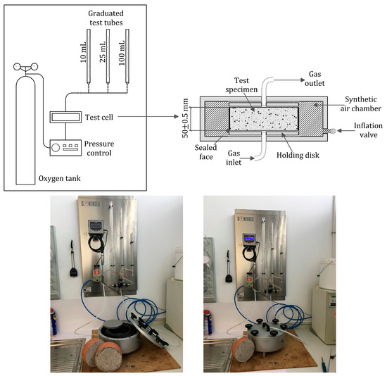 The oxygen permeability coefficient () was determined using Standard UNE 83981:2008 [116] at the ages of 28 days and 2, 6 and 12 months on cylindrical samples (Ø 150 mm and 50 mm height). The side surfaces of all the test specimens were epoxy-coated prior to testing to prevent oxygen release. Later specimens were oven-dried at 50 °C for 4 days and stored for 24 h in a desiccator for cooling, as depicted in the standard [116]. Once the conditioning process ended, tests were performed in a permeability cell filled with synthetic air as depicted in Figure 2. Oxygen permeability was analysed at five air pressure settings (1.2, 2, 2.5, 3 and 3.5 bar) in a Controls permeameter (model 58-E0031). Air flow was taken by measuring the time it took a soap bubble to travel through a glass tube of a known volume (in this case: 10 cm3, 25 cm3 and 100 cm3). was obtained according to Equation (2) depending on the test pressure: