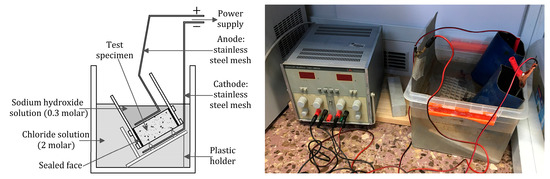 The chloride migration coefficient from the non-steady state migration experiment () was determined in accordance with Standard UNE-EN 12390-18:2021 [117]. Cylindrical specimens were used (Ø 100 mm and 50 mm height) and tests were performed at the ages of 28 days and 2, 6 and 12 months. The side surfaces of all the specimens were epoxy-coated prior to testing as indicated in the standard [117]. Later, they were vacuum-saturated with calcium hydroxide 24 h before testing. For tests, specimens were placed in a cell as depicted in Figure 3. One side was exposed to a 2-molar chloride solution and the other side to a 0.3-molar sodium hydroxide solution. Then a potential differential was applied between both specimen sides to force chloride migration through concrete. The value of the applied potential difference and test duration was determined according to the previously performed calibration by applying a potential difference of 30 V as the test standard points out [117]. After testing, each specimen was taken out from the measuring cell and axially split. Inner surfaces were sprayed with silver nitrate solution (0.1 M ), and chloride-polluted areas were indicated by a whitish colour. This enabled the penetration depth to be measured. Then, the chloride migration coefficient was determined according to the expression set out in the standard (Equation (3)):