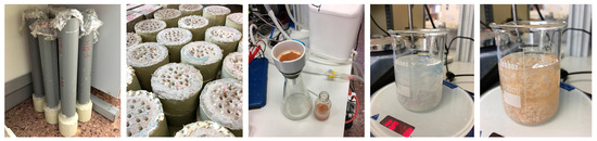 Chloride diffusion can also be determined using a non-accelerated test. In this case, the chloride diffusion coefficient from the non-steady state or apparent diffusion coefficient () was determined as depicted in Standard UNE-EN 12390-11:2019 [118]. This test was performed at the age of 28 days on cylindrical specimens (Ø 100 mm and 100 mm height). Prior to testing, specimens were epoxy-coated (except for the exposed face). Once the painting had dried, specimens were vacuum-dried in a chamber at a pressure between 1.0 and 5.0 kPa, where they remained for 3 h. Afterwards, the chamber was filled with demineralised water. After 24 h, the test specimens were removed from the vacuum chamber. Upon an uncoated surface, a water tank (300 mm high) filled with 0.5 M chloride solution was placed. Specimens were left under these conditions for 90 days as indicated in the standard [118]. After this time, a chloride analysis was performed on drilled-out samples obtained at different depths according to UNE-EN 14629:2007 [119]. Figure 4 shows some pictures of this process. Three batches from each mix were made and two samples per batch were analysed. The result of each mix was taken to be the arithmetic mean of the six recorded values.
