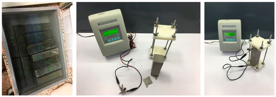 Concrete resistivity is another parameter that plays a key role in embedded rebar corrosion [120] because this material property refers to resistance to electric charge displacement. When rebar depassivation occurs, electrons are displaced through metal, where electrical resistance is practically unnoticeable. This process also requires ions to move through the concrete matrix. In this circuit, concrete’s resistance to ionic movement is that which controls corrosion process kinetics [121,122]. Concrete resistivity was determined according to Standard UNE-EN 83988-1:2008 [123] on prismatic specimens (40 × 40 × 160 mm3). Once the curing process had finished, the two specimen ends were cut to remove the concrete layer cover in the area where the electrodes were placed because this layer was richer in cement than the rest of the specimen owing to the wall effect that occurs during casting in the areas in contact with formworks [124,125]. Later test specimens were vacuum-dried in a chamber at a pressure lower than 0.15 kPa. They remained under these conditions for 3 h. Afterwards, the chamber was filled with demineralised water. After 24 h, specimens were removed, they were surface-dried with a damp cloth and conductivity I was determined by applying a uniform electric field using two flat stainless-steel electrodes (40 × 40 mm2) that came into contact with specimens’ bases. To ensure good electrical contact between electrodes and specimens, some previously dampened sponges of the same area as the electrodes were placed. To ensure that the applied pressure was homogeneous, a press with two nylon plates and metal bars was used. Measurements were taken with a commercial conductivity meter (model Crison GLP 32) (Figure 5). The value was recorded 1 min after measurements commenced to ensure that the recorded signal was stable enough. Concrete resistivity ( in Ωm) was obtained according to Equation (4):