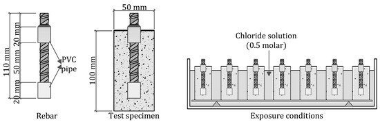 The corrosion rate analysis was performed on the rebars (B 500 SD, Ø 10 mm and 100 mm long) embedded in the cylindrical test specimens (Ø 50 mm and 100 mm height) as depicted in Figure 6. As observed, rebars were partially protected with a PVC pipe filled with epoxy painting. The surface area in contact with concrete was delimited to 50 mm (1571 mm2). The end of the bar was used for electrical contact purposes while taking measurements, and it was protected with Vaseline to prevent corrosion. After the curing period (at the age of 28 days), the top of the specimens was epoxy-coated. They were later partially immersed (up to 75%) in 0.5 M sodium chloride solution, which was prepared according to ASTM D1141-98 (2021) [126]. The exposure condition lasted for more than 3 years. Three batches from each mix were made and four samples per batch were analysed. The result of each mix was taken to be the arithmetic mean of the 12 recorded values.