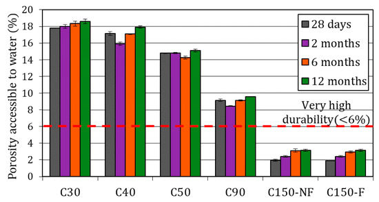 The PAW in UH concretes (C150-NF and C150-F) ranged between 2% and 3%, below the threshold to be considered as very high durability concretes (<6%) [37]. These results were 75% lower than those obtained in the C90, and almost one order of magnitude lower than the C50 (14–15%) and the C30 and C40 concretes, where the results ranged between 16% and 19%. The HPC and UHPC were less porous than the rest due to the applied doses: a lower water/cementitious material ratio (<0.32), as well as a more homogenous mix given the maximum size of the employed aggregates. Different authors have proven that, apart from these details, including silica fume in mixes allows for lowering the percentage of pores in hardened concrete, and results in porous structures with greater tortuosity [134,135,136,137]. This phenomenon means lesser pore interconnection, which significantly limits water permeability, as the obtained results reveal.