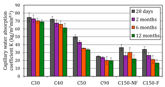 The capillary absorption coefficient () obtained for each concrete type and for all the testing ages appears in Figure 9.