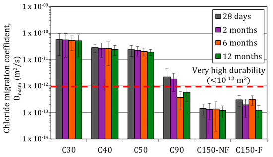 The values obtained for concretes C30, C40 and C50 were between 6.9 × 10−11 and 4.3 × 10−11 m2/s. In concrete C90, was 1.1 × 10−12 m2/s, which was more than one order of magnitude lower. Regarding the UHPCs, the value for C150-F was 3.0 × 10−13 m2/s, with 6.9 × 10−14 m2/s for C150-NF, which are four-fold lower. The tendency in the obtained results was similar to that noted in the accelerated migration test. However, authors like Andrade [157] have demonstrated that comparing both testing methods is unsuitable because they involve different diffusion processes.