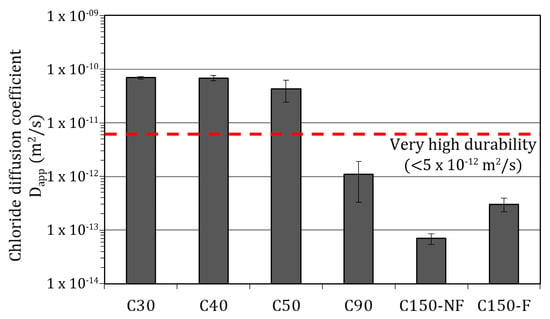 During the porosity analysis, it was impossible to establish clear differences between concretes C150-NF and C150-F. Conversely, differences were noted when analysing chloride penetration resistance. The obtained results indicated to be between 5% and 50% higher when steel fibres were included in mixes (C150-F). Other authors have also reported this situation for accelerated chloride diffusion tests using UHPCs with and without fibres [145,146,147,148,149]. Some studies point out that the interfacial transition zone of steel fibres and the cementitious matrix is weaker (higher porosity) than that of aggregates and the cementitious matrix, which slightly favours chloride penetration compared to mixes to which no fibres are added [150]. Furthermore, the existence of fibres can lead to the formation of fibre balls with pores inside them [151,152,153]. Nevertheless, the values obtained in both concretes (C150-NF and C150-F) were well below the threshold set out for very high durability (1 × 10−12 m2/s) [37].