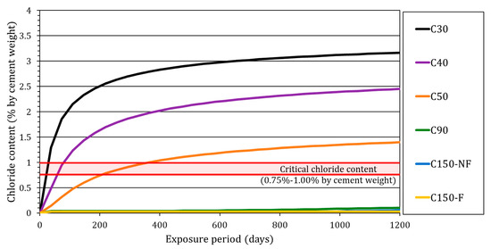 The critical chloride content for corrosion onset () to occur is an extensively studied value. In the last 50 years, a considerable amount of papers with values for it has been published [14,158]. However, no specific value for this parameter is found in the literature. The different study conditions of each work or the methodology used to determine it mean that the literature contains a wide range of proposed values, with values scattering over two orders of magnitude according to [158]. Given this situation, many authors take a value of = 1% chloride content by cement weight to make estimations [159]. Accordingly, the graph in Figure 15 shows the interval from 0.75% to 1.00% of chloride content in relation to cement weight as a threshold at which rebar depassivation takes place. This has served to forecast the estimated period for corrosion onset to occur in each concrete when considering a 20 mm cover. For concretes C90, C150-NF and C150F, the intersection between the obtained curves and the threshold from 0.75% to 1.00% chloride content by cement weight was much superior to the period study (3 years). Conversely with concretes C30, C40 and C50, the time estimated during which corrosion onset would occur was 36, 75 and 255 days, respectively.