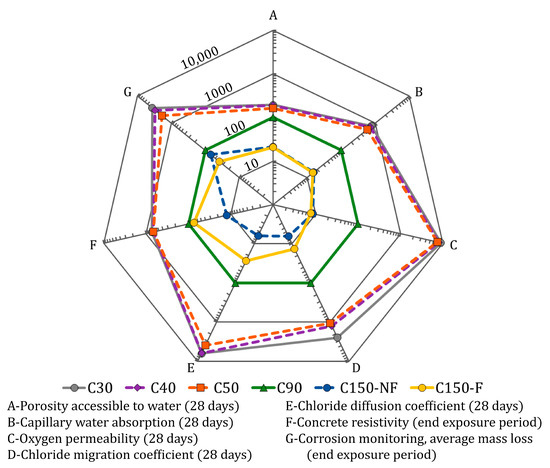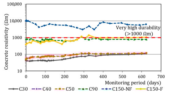 The importance of studying this parameter lies in the fact that it is a good indirect indicator of concrete durability. The reinforcement corrosion rate is associated with availability in the cementitious matrix [112]. These results, along with those obtained from the PAW and capillary absorption tests, allowed for the properties of the concretes’ porosity to be clearly differentiated.
