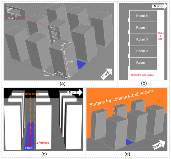 (a) The city block; (b) The cross-section of the target building; (c) The vertical measurement lines, street, and vehicles outside the target building; (d) The surface for contours and vectors.