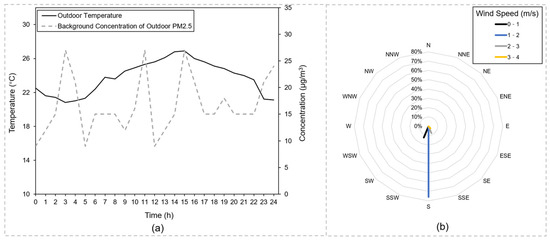 (a) The outdoor temperatures and background concentrations of outdoor PM2.5 for day three; (b) The wind rose for day three.