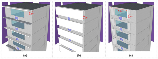 The window in each room was closed during the entire simulation period. According to information provided in the BD database [32], three types of exterior shading devices were modeled, including horizontal overhangs, vertical overhangs, and vertical fins. The modeled exterior shading devices cover the exterior shading devices that are applied to more than 90% of the office buildings in Hong Kong [38]. The dimensions and schematic of individual exterior shading devices can be seen in Figure 3. It should be noted that in practice many overhangs have louvers that can swing open or closed. For simplicity, the overhangs modeled in this study were assumed to have all the louvers closed. In addition to the shading strategy that no shading was assigned to the building, there were four shading strategies in total (Table 2).