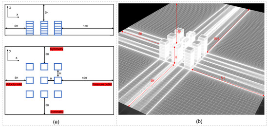 The computational domain of the flow filed can be seen in Figure 4. The distance between the city block and each boundary was determined following the recommendations of COST [46] and AIJ [47]. To match the sizes of the models used in validation, the computational domain was scaled down at a ratio of 1:25. The independence of the Reynolds number () needs to be checked when constructing a reduced-scale model [48]. Simulation results indicate that the values of were approximately at the height of the building and approximately around outdoor units and exterior shading devices, meeting the independence requirement (i.e., ) [48].