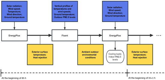The data exchange between these two models was facilitated by a bespoke code written in MATLAB [52]. A schematic of the coupling approach can be seen in Figure 5. The EnergyPlus model was first run with the environment data file detailed in Section 2.1.1, estimating exterior surface temperatures and heat rejection rates. Then the Fluent model was run with the calculated exterior surface temperatures and heat rejection rates, estimating ambient outdoor temperatures, ambient outdoor PM2.5 levels, and wind pressure coefficients. It should be noted that the ambient outdoor temperatures or ambient outdoor PM2.5 concentrations of a room were determined by averaging the temperatures or concentrations of the cells adjacent to the exterior surfaces of the room. Finally, the EnergyPlus model was run with an environment data file that was modified to reflect the calculated ambient outdoor environmental conditions, estimating cooling loads, indoor PM2.5 levels, exterior surface temperatures, and heat rejection rates. The data exchange process took place at the beginning of each hour of the simulation period.