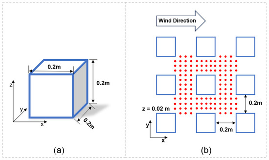The Architectural Institution of Japan (AIJ) [47] provided data on the velocities of the air in a wind tunnel. A city block composed of nine cubes with the same dimensions (length: 0.2 m; width: 0.2 m; height: 0.2 m) was placed in the wind tunnel (Figure 6). The width of individual street canyons was 0.2 m. Based on the recommendations from COST and AIJ [46,47], a computational domain was developed for the wind tunnel using Fluent. The height of the first near-wall grids on the exterior surfaces of cubes and the ground was 0.003 m, leading to a mean y* of approximately 98. The boundary conditions of the Fluent model were the same as the ones of the wind-tunnel test.