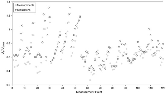A total of 120 measurement points (Figure 6b) were placed at a height of 0.02 m above the ground to measure the velocities of winds within the street canyons. The wind velocity was normalized by dividing the velocity value () by the inflow velocity at the same height (). Results for the measured and simulated normalized wind velocities can be seen in Figure 7, which indicates that the simulated wind velocities were generally in agreement with the measured ones. Large discrepancies were observed for the data points close to blocks. This was primarily due to the well-known weakness of the selected turbulent model in representing the turbulent kinetic energy in the layers adjacent to solid surfaces [53].