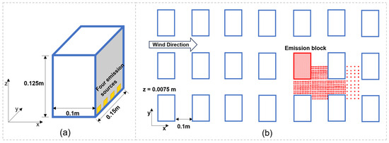 The Meteorological Institute of the University of Hamburg [57] provided data about the dispersion of air pollutants in a wind tunnel. A city block composed of rectangular blocks with the same dimensions (length: 0.15 m; width: 0.10 m; height: 0.125 m) was placed in the wind tunnel (Figure 8). The width of individual street canyons was 0.1 m. Following the recommendations from COST and AIJ [46,47], a computational domain was developed for this wind tunnel using Fluent. The height of the first near-wall grids on the exterior surfaces of blocks and the ground was 0.002 m, leading to a y* of around 83. The boundary conditions of the Fluent model were the same as the ones of the wind-tunnel test. The pollutants were emitted at an overall rate of 0.1 m/s from four sources placed at the bottom of the emission block (Figure 8a), with the total emission area being 4.6 cm2.