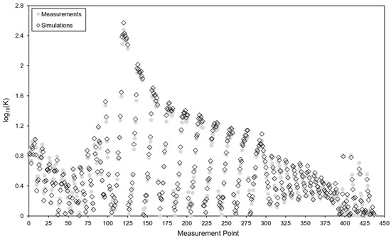 A total of 437 measurement points (Figure 8b) were placed at a height of 0.0075 m above the ground, measuring the concentrations of pollutants within the street canyons. The measured pollutant concentration was normalized to a dimensionless K value, which can be written as follows: