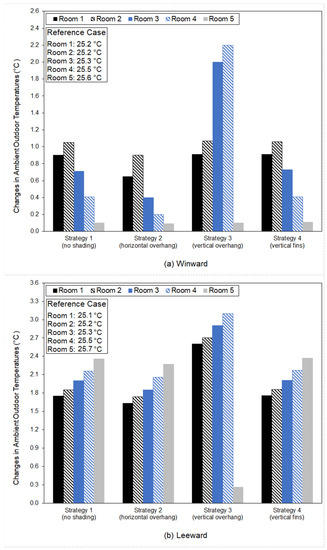 Like the windward scenario, the leeward scenario predicted increased cooling loads for the building operating under Strategy 1. However, the increase in the cooling loads of the building was 69.7% smaller in the windward scenario than in the leeward scenario. The building had a lower increase in cooling loads after the implementation of exterior shading devices. Comparisons between the four strategies show that Strategy 1 resulted in the highest increase in the cooling loads of the building, then Strategy 3, then Strategy 4, and finally Strategy 2. When broken down by room, all the rooms had an increased demand for space cooling due to the increased ambient outdoor temperatures caused by heat rejection (described in Section 3.1.2), the exception being Room 5 under Strategy 3.