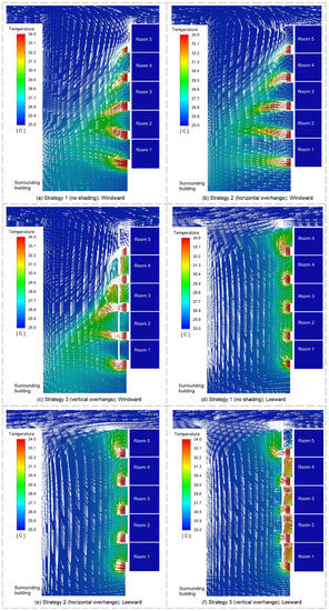 The effect of outdoor units or exterior shading devices on the ambient outdoor environment of a building has been examined in several studies. Chow and Lin [8] used a computer program to estimate temperatures of the air around the outdoor units installed in a building re-entrant and concluded that (1) heat rejection from the outdoor units of rooms on lower floors could increase the ambient outdoor temperatures of rooms on higher floors, and (2) this temperature increase resulted in a reduction in the energy efficiency of outdoor units and therefore caused an increase in space-cooling energy consumption. Hsieh et al. [9] examined how heat rejection from outdoor units affected the thermal environment outside a high-rise building and suggested that installing the outdoor units on every third floor helped slow down the increase in ambient outdoor temperatures caused by heat rejection. Han and Chen [10] evaluated the impact of the positions of outdoor units on the ambient outdoor temperatures of buildings and pointed out that outdoor units should be placed outside of building gaps to avoid the accumulation of heat in those gaps. In terms of exterior shading devices, a modeling study carried out by Cui et al. [11] indicates that overhangs had a significant impact on the pattern of the airflow within a street canyon, while vertical fins only had a minor impact. Research by Xiong and Chen [12] shows that the use of overhangs led to an increase in the speed of the air near windows. Zheng et al. [13] used a numerical method to analyze the characteristics of the airflow near the windows that were externally shaded by louvers and found that there was a significant variation in air exchange rates due to the vortexes produced between windows and louvers.