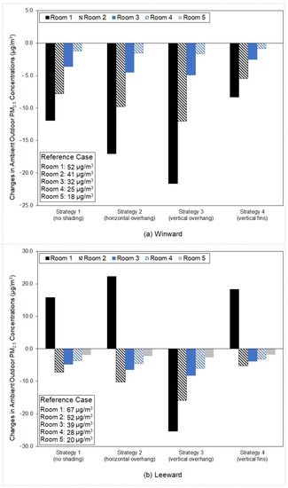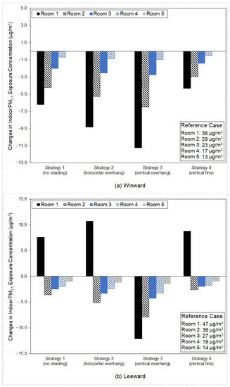 Like the windward scenario, the leeward scenario shows a positive correlation between indoor PM2.5 exposure concentrations and ambient outdoor PM2.5 concentrations. An increase in the indoor PM2.5 exposure concentrations of Room 1 could be seen under Strategies 1, 2, and 4, due to the increased ambient outdoor PM2.5 concentrations described in Section 3.2.2. A reduction in the indoor PM2.5 exposure concentrations of Rooms 2 to 5 could be seen under each strategy, attributable to the reduced ambient outdoor PM2.5 concentrations. Comparisons between the four shading strategies show that Strategy 3 led to the greatest reduction in the exposure of occupants to indoor PM2.5.