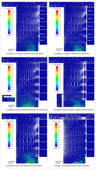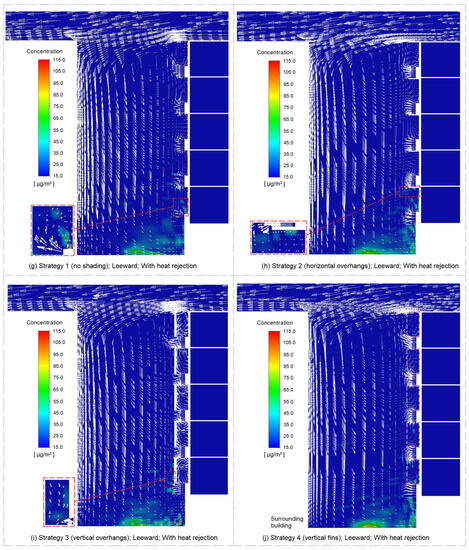 - In the windward scenario, heat rejection from outdoor units, horizontal overhangs, and vertical overhangs helped limit the movement of PM2.5 from the street to the ambient outdoor environment of the building; occupants thus had a reduced risk of exposure to indoor PM2.5. In the leeward scenario, heat rejection from outdoor units, horizontal overhangs, and vertical fins were found to increase the accumulation of PM2.5 within the ambient environment of the bottom-floor room; occupants of this room thus faced an increased risk of exposure to indoor PM2.5. Outdoor units should be coupled with overhangs rather than vertical fins to improve indoor air quality;