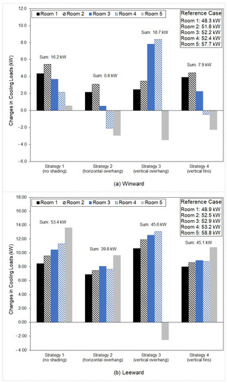 Under Strategy 1, the cooling loads of each room increased due to the increased ambient outdoor temperatures caused by heat rejection (described in Section 3.1.1). The results of Strategies 2, 3, and 4 show that for some rooms (including room 4 and Room 5 under Strategy 2, Room 5 under Strategy 3, and Room 4 and Room 5 under Strategy 4), the increase in cooling loads caused by heat rejection was more than offset using exterior shading devices. The change in the cooling loads of the building was calculated by adding up the changes in cooling loads of individual rooms. Under each strategy, the building had an increase in cooling loads, ranging from 0.8 kW to 18.7 kW. Comparisons between the four shading strategies show that Strategy 3 resulted in the highest increase in the cooling loads of the building, then Strategy 1, then Strategy 4, and finally Strategy 2. Surprisingly, the building had a greater increase in cooling loads after the implementation of vertical overhangs. This result indicates that in the presence of heat rejection, the use of vertical overhangs does not always mean lower demand for space cooling.