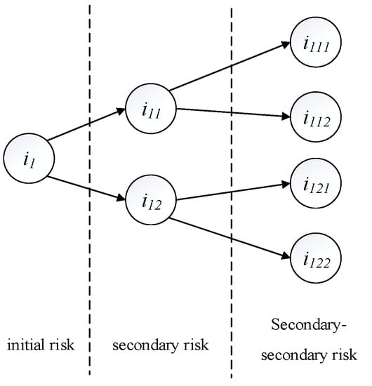 When considering the interdependence of risks , where  leads to secondary risk  and  leads to secondary-secondary risk ,  values are non-zero, and conversely. As illustrated in Figure 1, only  and  exhibit non-zero values. In this model, the relationship among  must be maintained, as depicted in Figure 1. This study solely focuses on secondary-secondary risk, thus disregarding the expected loss of third-secondary risk.