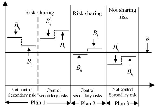 When a risk decision maker anticipates a risk control benefit denoted as B, they face a critical determination of whether to partake in risk sharing. This decision hinges on a careful evaluation of both the associated risk control costs and the potential benefits. The decision-maker’s choices can manifest in three distinct schemes: 1. if , the decision leans toward risk sharing. Moreover, in cases where the management of secondary risks promises loss reduction, the decision is to control those secondary risks, and vice versa. 2. In scenarios where , a potential strategy is to reduce losses through the control of secondary risks, aligning outcomes with expected returns, and thereby opting for risk sharing. 3. In situations where  simultaneous secondary risk management cannot ensure the desired returns, the choice is to avoid risk sharing. The alterations in risk control returns across these three schemes and their respective risk-sharing strategies are shown in Figure 2.