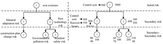 We first define the risk arising from the response to the original risk as secondary risk, the risk arising from the response to the secondary risk as secondary-secondary risk, and the risk arising from the response to the secondary-secondary risk as the third secondary risk, and the following risk names can be followed by analogies. Before delving into secondary risk analysis, the meanings of symbols are explained. In this context,  denotes risk control full cost (including risk control coat and expected lost of secondary risk);  stands for risk expected loss;  represents the probability of risk occurrence;  signifies risk potential loss;  quantifies the cost of risk control;  indicates whether risk control is undertaken, where  equals 1 for controlled risks and 0 otherwise. E reflects the loss mitigated due to risk control. With , . Given the initial risk known within a collection of  PPP projects, the anticipated loss of the initial risk , denoted as  []. In scenarios where the control of the initial risk  yield  secondary risks, each secondary risk  carries an expected loss of  []. Consequently, the cost of controlling the initial risk  is expressed as: