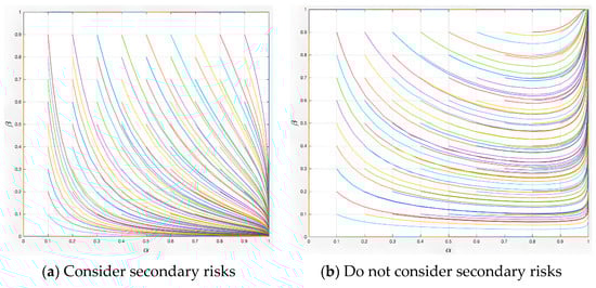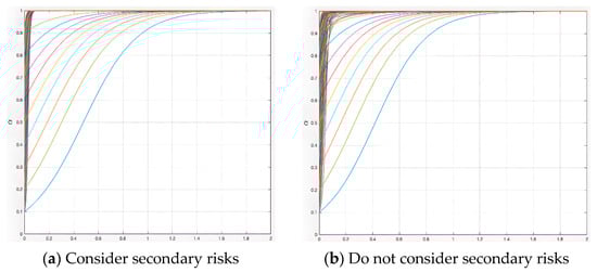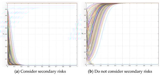 Figure 5, Figure 6 and Figure 7 depict the evolutionary trends of strategies, contrasting scenarios with and without consideration of secondary risks. Figure 5a illustrates the strategic evolution of both parties while accounting for secondary risks, while Figure 5b represents their strategic evolution without such consideration. A comparison between Figure 5a,b reveals that the inclusion of secondary risk has a discernible impact on the evolutionary stability strategies of both parties, transitioning from the initial state of (share, not share) to (share, share). Figure 6a (with the horizontal axis representing evolution time) showcases the progression of public sector strategies, considering secondary risks, whereas Figure 6b (also with the horizontal axis representing evolution time) portrays the evolution of public sector strategies without considering secondary risks. By analyzing the contrast between Figure 6a and Figure 6b it becomes evident that accounting for secondary risks can expedite the decision-making process of the public sector regarding risk-sharing strategies. Similarly, Figure 7a (with the horizontal axis representing evolution time) illustrates the strategy evolution of the private sector when secondary risks are considered, and Figure 7b (also with the horizontal axis representing evolution time) showcases the strategy evolution of the private sector without accounting for secondary risks. A comparison between Figure 7a,b, underscores the significant impact of secondary risks on the private sector’s risk-sharing strategy, transitioning from the initial non-sharing stance to the predominant strategy in most cases. This underscores that by attentively addressing and effectively controlling secondary risks, both public and private entities can be incentivized to actively participate in risk-sharing.