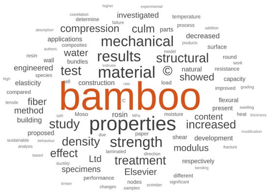 The general topic for the review had already been recognized as “Use of bamboo culms as building materials in construction”. Presently, Scopus provides 14,456 articles for “bamboo”, 1753 articles for “bamboo culms”, 86,867 for “building materials”, and 437,526 for “construction”. These keywords were combined and used the advance search and Boolean operators. The search was filtered to articles only and limited to subject areas such as engineering, material science, environmental engineering, chemical engineering, agricultural and biological sciences.