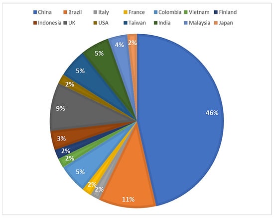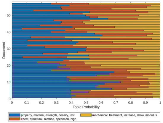 These articles underwent a rigorous manual screening, wherein they were assessed based on specific author and index keywords. Only those articles that contained relevant terms such as “bamboo”, “bamboo culms”, “bamboo poles”, “bamboo species”, “bamboo properties”, “bamboo construction”, “building materials”, or a combination of these were considered for inclusion. Subsequently, the abstracts of the identified articles were scrutinized to evaluate their relevance to the study. Only those abstracts that provided a clear and concise discussion of essential aspects of bamboo properties, species, testing, treatments, and a key summary of findings in relation to bamboo performance and properties were selected. As a result of this thorough approach, a total of 57 articles were meticulously reviewed and systematically assessed to gather comprehensive insights on the subject matter. However, additional references were also incorporated to address issues on topics regarding properties, treatments, applications, and standards to provide a methodical and in-depth understanding. The 57 articles were imported into Matlab software (R2023a) for Text Analytics. The Matlab Text Data Analytics provides an overview of the topic by word clouds, topic mixtures, journal distribution, and publication year. The text analytics with Matlab can be useful in automating the process of extracting information from text, significantly reducing the time required for manual processing []. This method is similar to the studies of Ongpeng et al. [,], where Matlab Text Data Analytics was utilized for generating the topics. Figure 2 shows the word cloud generated, which contains regularly occurring words from the documents extracted. It can be seen that the distinct word is “bamboo” which is basically the general keyword of the study. The validation perplexity is shown in Figure 3, from 1 to 10 topics; the results show that of the three topics, the validation perplexity has the lowest value. For this graph, the lowest perplexity validation has the most suggested number of topics to be used []. Figure 4 presents the topic mixture generated, which shows the percentage of topic occurrence on each document through colors. Topic 1 (the blue color) highlights the words “properties, materials, strength, density, and test”. Topic 2 (the red color) emphasized the words “effect, structural, method, specimen, and high”. Lastly, Topic 3 (the yellow color) pointed to the words “mechanical, treatment, increase, show, and modulus”. These groups of words were interpreted and developed a specific topic for this study. For topic 1, the corresponding interpretation is the “Physical and mechanical properties of different bamboo species”. Topic 2 was interpreted as “Bamboo standards and structural applications”, and topic 3 was interpreted as “Bamboo culm treatment methods”. These three topics are discussed qualitatively in this paper. The publication year distribution of the collected articles is presented in Figure 5. The publication behavior shows an increasing and decreasing pattern. Few articles were published in 2006 to 2010 and 2014. The number of highest publications was in 2021, but decreased in 2022 and the present year. However, this is justifiable since we are still in the middle of the year 2023. Figure 6 shows the countries that have bamboo studies, of which 46% belong to China.